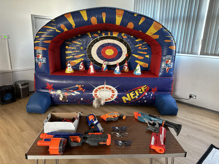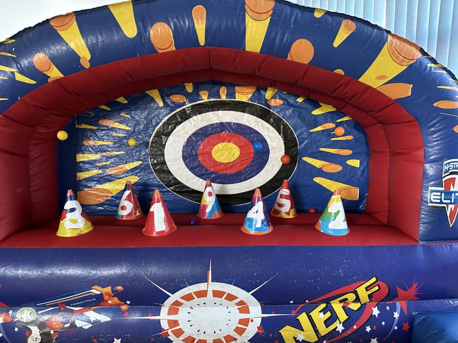 This is a perfect add on to any of our parties or even with a Bouncy castle. Comes with nerf guns and bullets with safety goggles. Perfect for all ages and even the big kids.