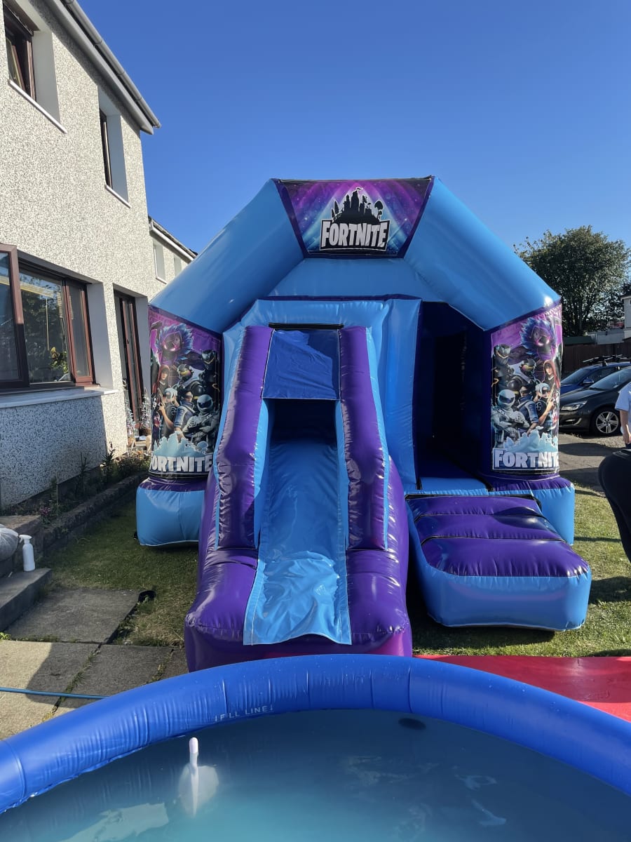 Our Fortnight Front Facing Combi Castle offers hours of bouncing and sliding fun. With a spacious bounce area and a slide at the front, children can enjoy endless entertainment while you keep a watchful eye on them. The vibrant blue and purple colors of the castle add an extra touch of excitement to any event.
